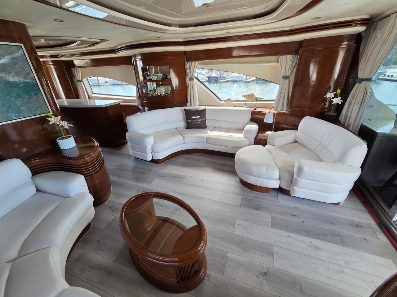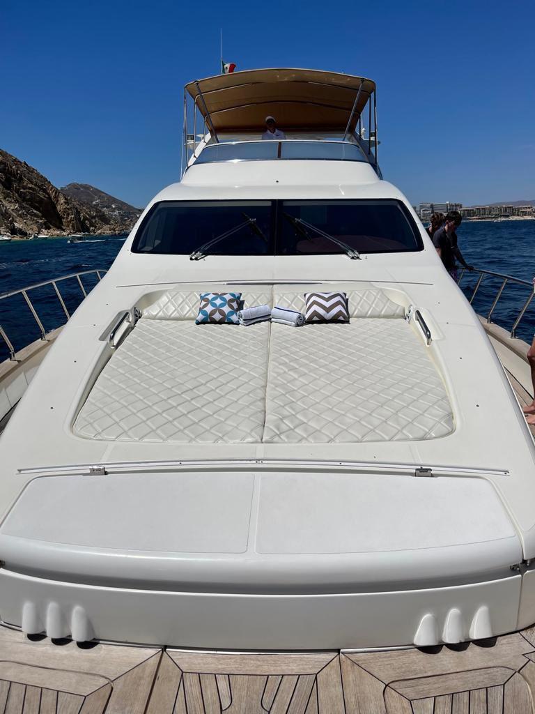 This 80-ft Azimut is stationed in San Jose del Cabo at the Puerto Los Cabos marina. Featuring 4 comfortable cabins, indoor dining area, full kitchen, and lots of exterior space for lounging and enjoying a day on the ocean. Guests enjoy a perfectly laid out flybridge, great for dining on calm days and a large bow with soft pads and pillows perfect for lounging and getting a tan. With a premium open bar, welcome amenities, restaurant quality chef menus, and many of your favorite water toys, this yacht delivers an unforgettable charter experience every time.